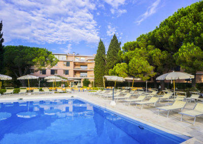 Camere: Dispone di 148 camere, suddivise in due edifici vicinissimi tra loro. Possono trovarsi al primo, secondo e terzo piano con vista piscina o parco. L’ascensore è presente solo nel corpo centrale. Le camere si suddividono in doppie, triple, quadruple (con letto a castello) e family con doppio ambiente. Tutte le camere sono modernamente arredate e dispongono di servizi box doccia, aria condizionata, telefono , frigobar (riempimento su richiesta a pagamento ) cassaforte , TV sat. Alcune camere sono provviste di balcone, con supplemento.